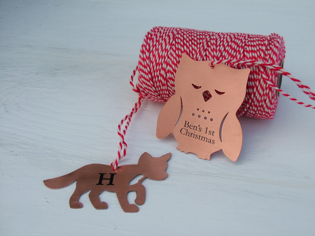 Choose from a variety of delightful little copper friends - fox and fox cub, reindeer, squirrel, or baby owl. You can also choose your own font for the personalisation.