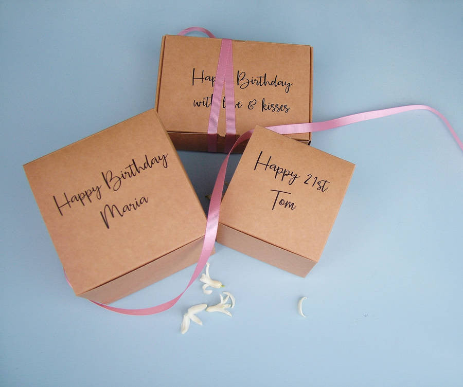 Simply beautiful brown kraft gift boxes boxes, personalised with your choice of name or message these are ready to add coloured ribbon to create totally bespoke wrapping.