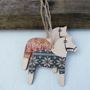 Pretty little ponies in their own printed Christmas jumpers with your own name or message added. These must be top of teh Christmas cute list in the workshop here. A lovely gift equally at home on the Christmas tree or hanging around the house. We have a pair printed with Merry and Xmas hanging above the mantlepiece. Sure to raise a smile from adults and children. They are made from birchwood, hand printed and trimmed with a nice rustic jute string hanger.