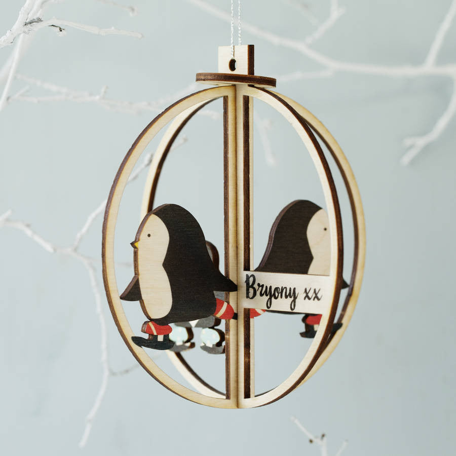 A unique and intricate wooden bauble and keepsake featuring gorgeous little skating penguins and a name or short message printed on natural birchwood.