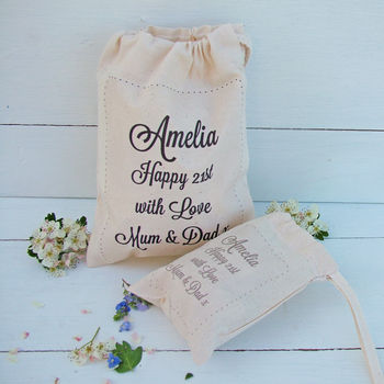A lovely alternative to gift wrap, our heavy cotton drawstring bags are hand printed with a striking setting of your own text - either a message, or initials or a name and date. Ideal for birthday gifts, wedding favours, wedding gifts or for anniversaries.