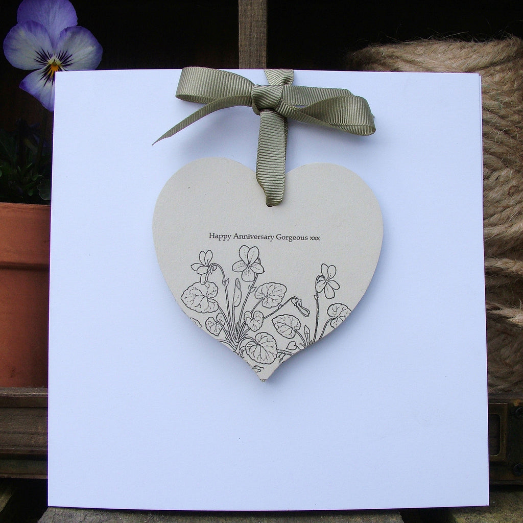 We will add your message to your chosen flower design and mount on a little wooden heart which is then fixed to heavy card. Your heart can be hung on the card with grosgrain ribbon or fixed directly onto the card with a ribbon tie.