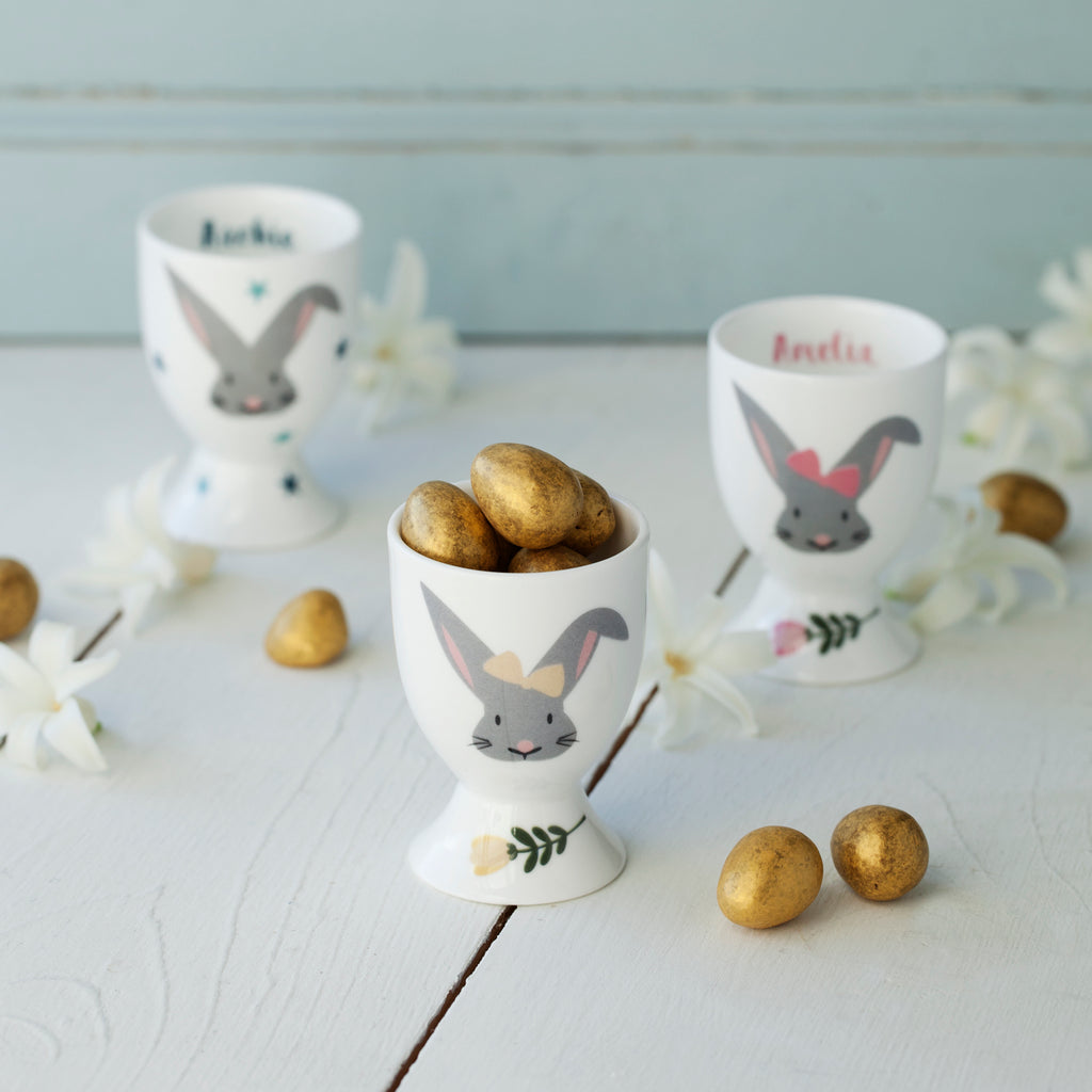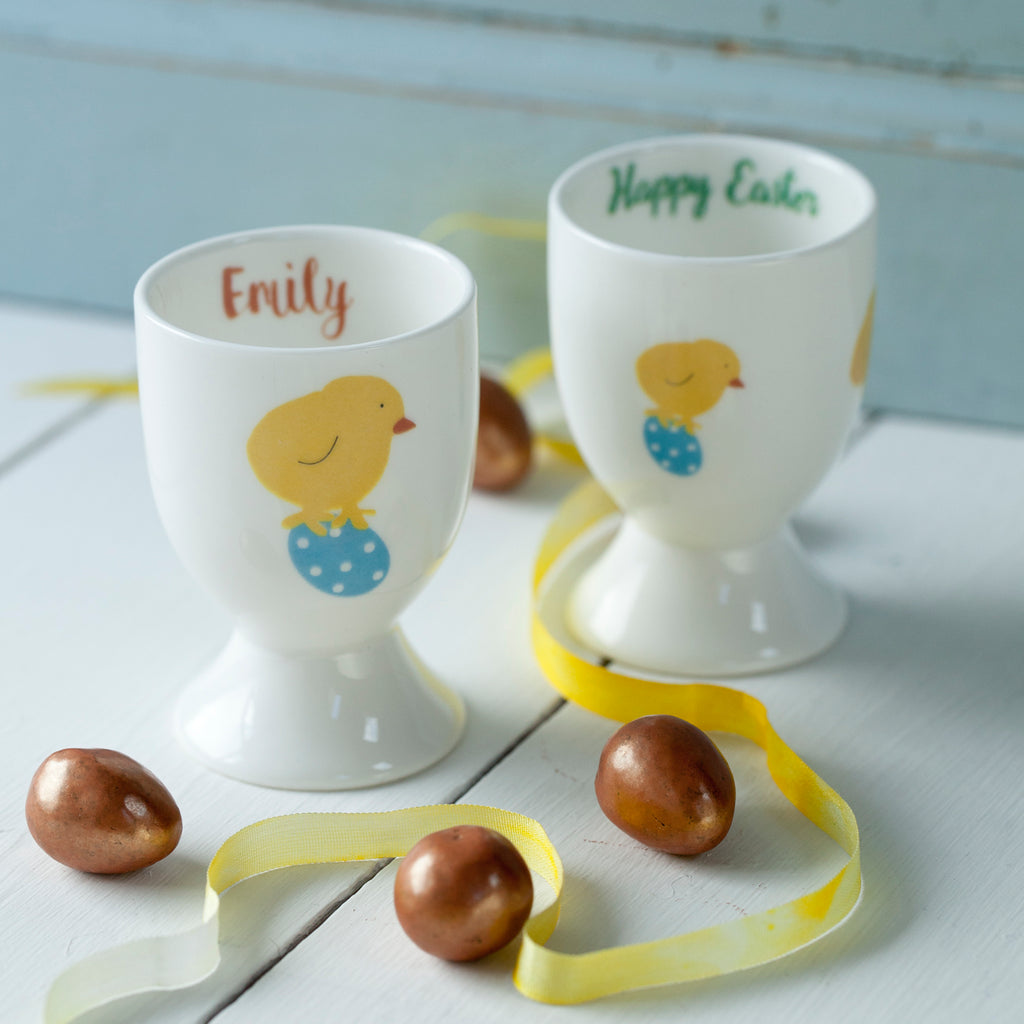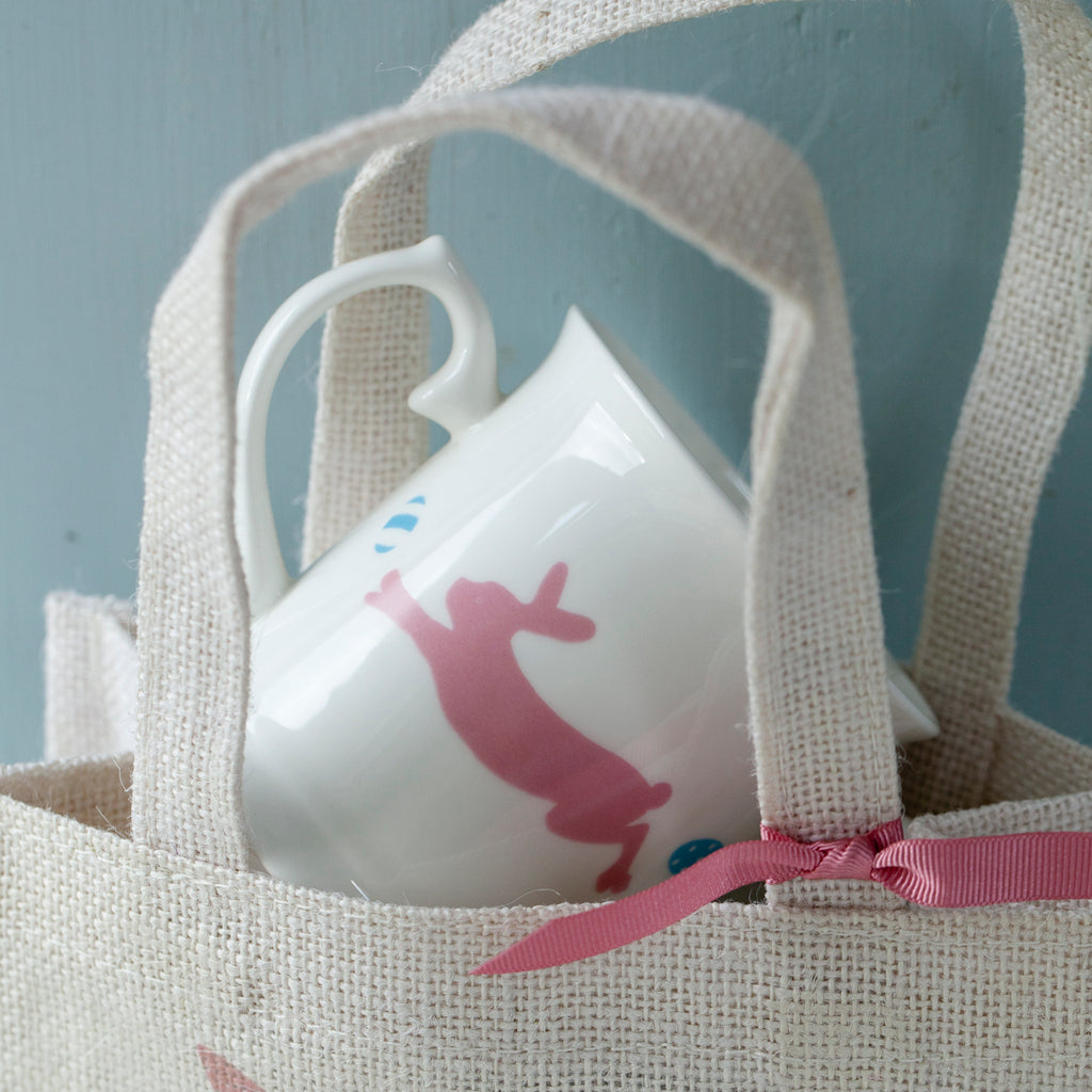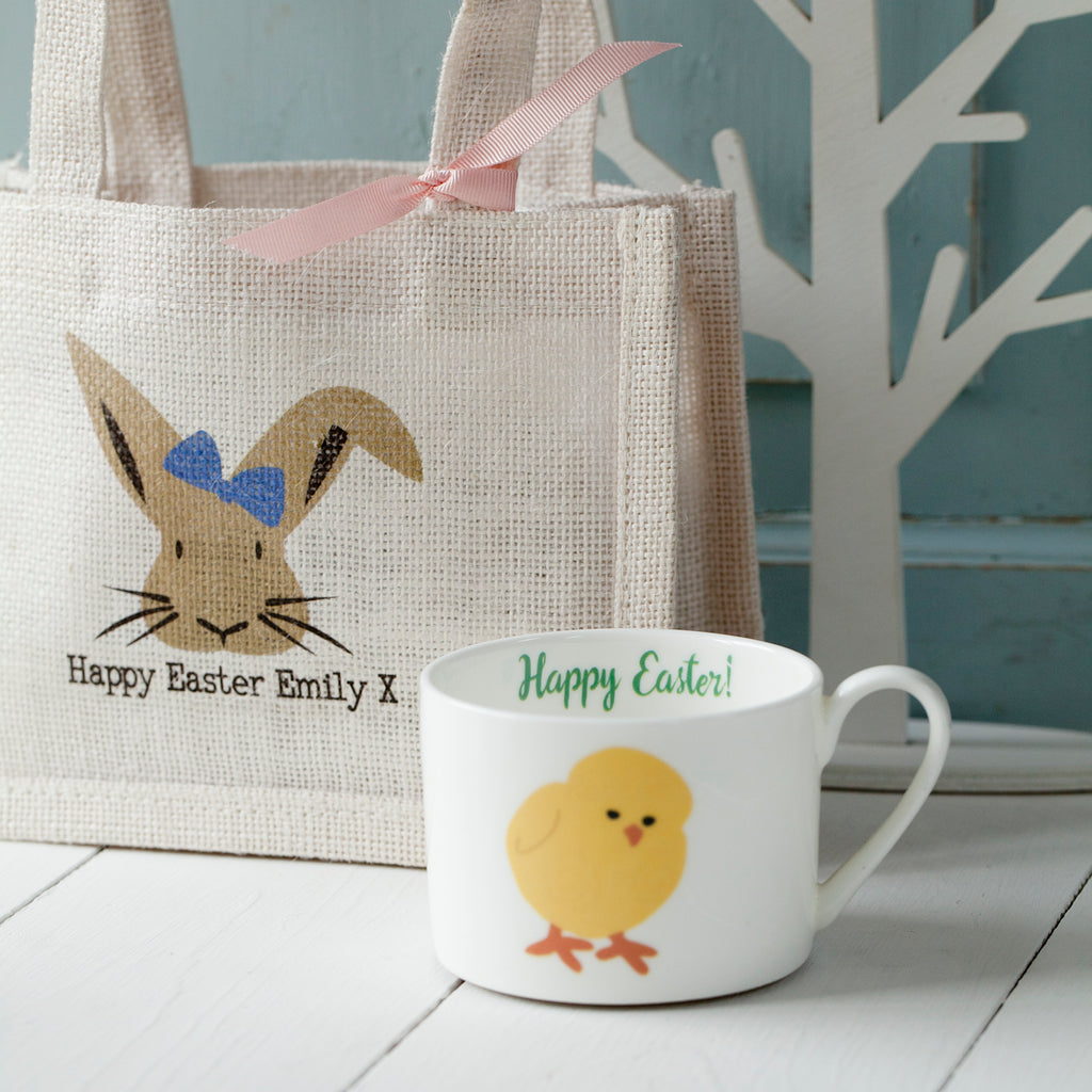 A personalised Jute Easter Hunt bag with a china egg cup, or mug inside for a very special Easter surprise!  Choose a design and add some text, which we'll  apply to both china cup and egg hunt bag, making them that extra bit special and personal.