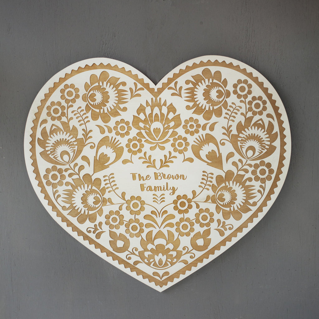 A real statement piece, a large wooden plaque intricately engraved with a beautiful folk art style design and a message of your choice.