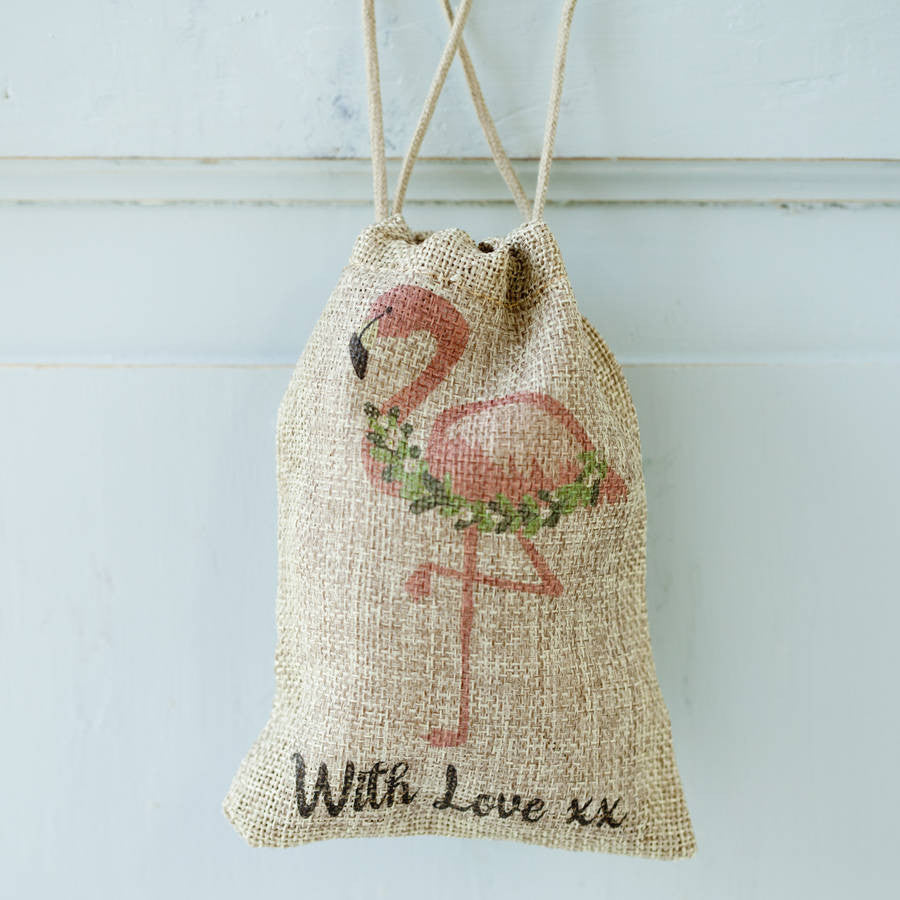 Made from hessian with string drawstring, with your choice of flamingo and mistletoe wreath designs and a short message.