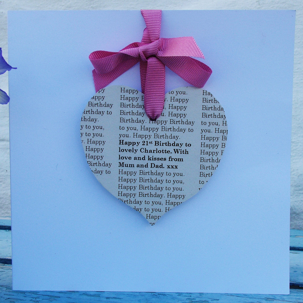 We will will add your message to a generic message in newsprint, and mount it on a little wooden heart or a little wooden love bird. Your message will blend into the background print, a little secret sentiment. Your chosen heart or love bird can be hung on grosgrain ribbon on the card with a little sticky pad to secure it or fixed directly onto the card. Fixed hearts come with ribbon tied around the card and secured at the back.